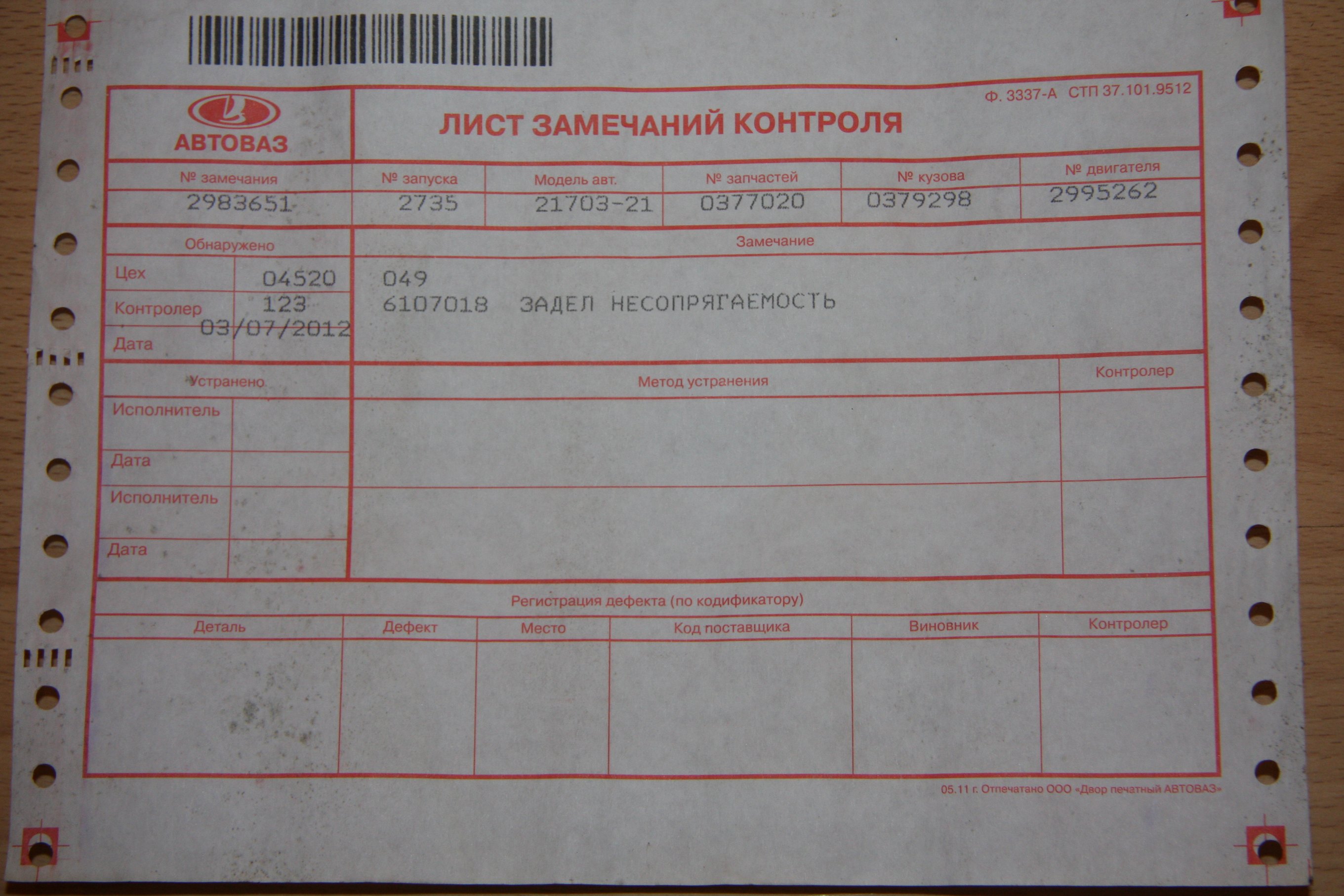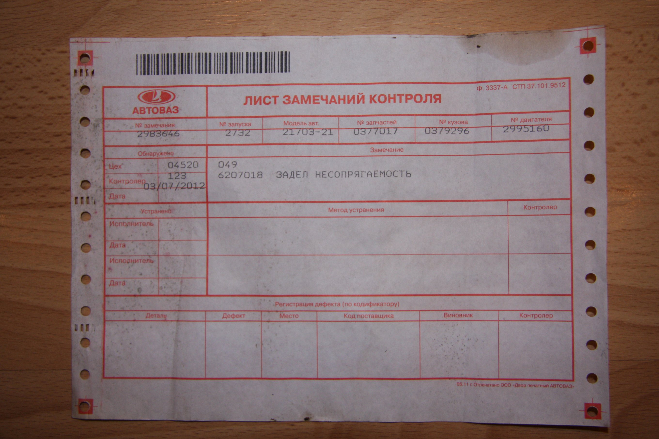 Конечно же, я понимаю, что ни ОТК, ни руководство автозавода, ни тем более президент ВАЗ не думают так, как написано на крайнем листе замечаний и контроля. Скорее всего, некие молодые люди решили неудачно пошутить. Видимо, это учащиеся ПТУ(если такое есть на заводе), или стажеры. Все равно, осадок остался.