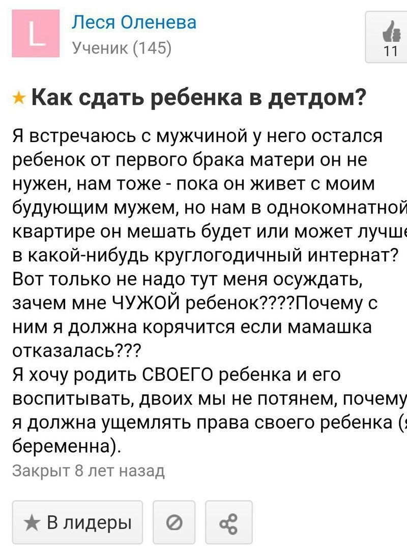 Ну и сука...Чему удивляться, любовь к мужику прошла у первой , ребёнка за борт , сколько их таких ненужных ...эта родит и с такими жизненными принципами не факт , что будет ростить, мужика поменяет и зачем ей ребёнок от старого, если можно новенького родить.. тоже сдаст в круглогодичный интернат,уроды! Но решение простое, вырезать вовремя матку и яйца, кидать собакам, и как бы и волки сыты и дети целы.