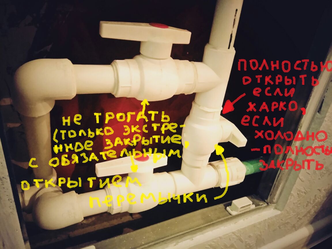 Несколько лет назад сделал ремонт, поменял батареи. Точнее, мне поменяли. И поставили такие три краника для регулировки температуры. Никогда не пользовался, а теперь понадобилось убавить, но когда закрываю кран - перекрывает весь стояк (живу на верхнем этаже). Попробовал пару вариантов, но башка дырявая - даже не помню, какие краны закрывал. Экспериментировать с соседями уже не хочется =) Может кто-нибудь по фотографиям сказать, какой кран крутить?