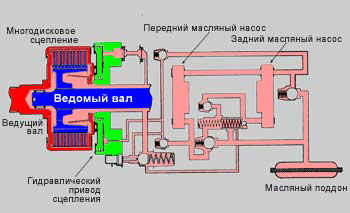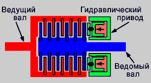 На рисунке изображено многодисковое сцепление с гидравлическим приводом. Элементы, выделенные красным цветом это ведущий вал и ведущие диски сцепления (диски обведены черной линией). Элементы, выделенные синим цветом - ведомый вал и ведомые диски сцепления (ведомые диски так же обведены черной линией). Салатовым цветом выделен гидравлический привод. Розовым цветом в гидравлическом приводе обозначен объем, куда нагнетается масло при включении сцепления.