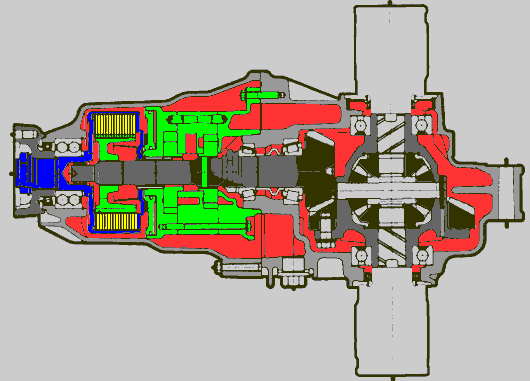 Определим элементы, входящих в состав механизма привода задних колес. Рисунок ниже - это разрез механизма, раскрашенный разными цветами. Тонами серого цвета выделены элементы, присущие любому заднеприводному автомобилю: главная передача, дифференциал и корпус, в котором это все находится. Красным цветом выделены полости в которых может находиться масло в процессе работы (масло не заполняет весь свободный объем). Остальные цвета (салатовый, синий и желтый) применены для выделения элементов DPS.