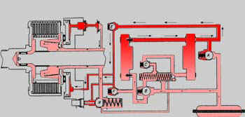 Представьте, что насос номер 1 приводится во вращение передней осью автомобиля, а насос номер 2 - задней осью. При движении по прямой с постоянной скоростью по асфальтированной дороге, оба насоса вращаются с равными скоростями. В гидравлической схеме отсутствуют области пониженного или повышенного давления. Если передние колеса начинаю буксовать (например на льду), передняя ось начинает вращаться быстрее чем задняя и производительность 1-го насоса становится больше чем производительность 2-го насоса. Установив многодисковое сцепление, подобное изученному ранее, в механизме привода задних колес автомобиля и организовав подачу к нему масла из области с повышенным давлением, можно обеспечить передачу мощности (от двигателя или передней оси) к задним колесам, т.е. автомобиль станет полноприводным.