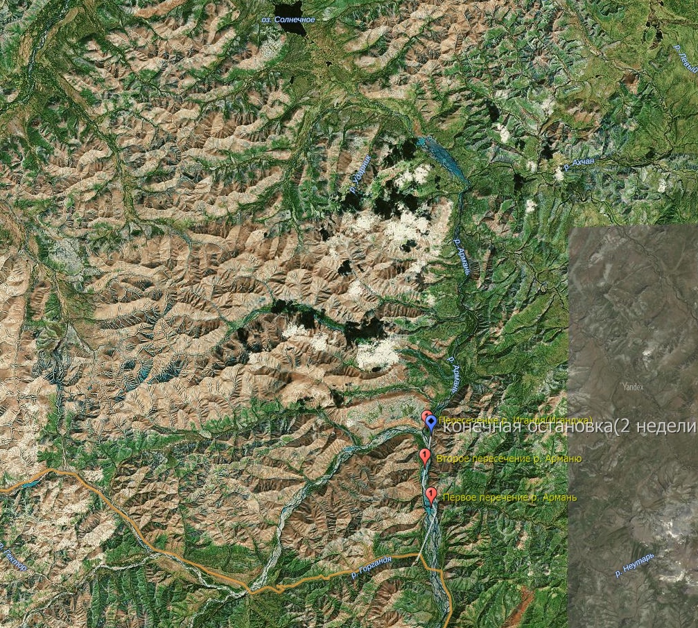 Предварительно выезд в четверг вечером. На р. Армани возле Мадауна ночевка. Следующим утром едем вдоль р. Армани (будет два перезда через р. Армань и один через р. Игандя или Иганджу(в разных картах по разному)). Далее дорогу знаем лишь по картам. Думаем, что к вечеру будем на оз. Солнечное. Следующий день гуляем, отдыхаем. В воскресенье поздним утром или днем(в зависимости от дороги) выезжаем тем же путем.