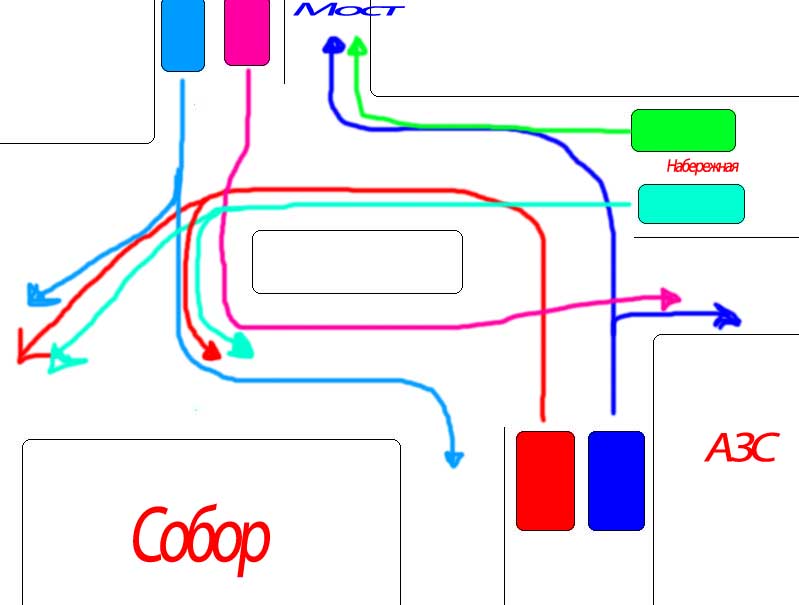 Получается, что идя по кольцу, параллельно друг к другу красная и желтая машины могут идти ноздря в ноздрю не мешая друг другу и спокойно выходить на ул. Ленина каждый в свою полосу, как показано на схеме. Дополнительно водитель красной машины может срулить на Берзина или на Транспортную.