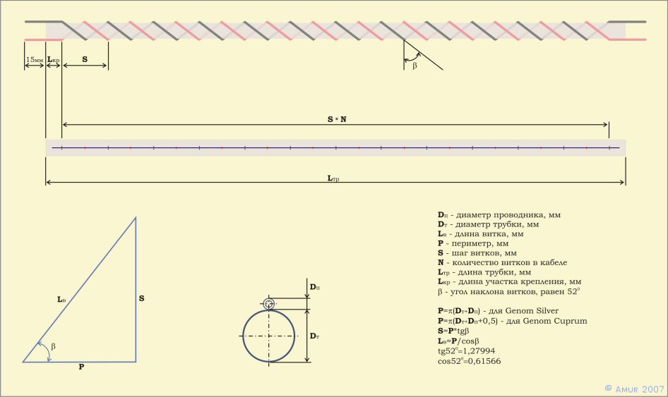 В отличие от конструкции предложенной Christopher J. VenHaus (http://www.venhaus1.com/diysilverinterconnects.html) в данном кабеле намотка проводников производится против движения часовой стрелки и угол наклона витков b составляет 52 градуса, что является принципиальным. Конечно, с точки зрения электродинамики оптимальным должен быть угол наклона проводников в 45 градусов, но в ходе проверки различных вариантов я пришел к выводу, что именно при угле наклона витков бликом к 52 градусам обеспечивается более "правильный звук" кабеля. Вероятнее всего, это связано с какими то фундаментальными принципами устройства Мира, подобно золотому сечению и мн. др. Данная величина угла часто встречается в различных живых системах, как, например, в спирали ДНК, четко прослеживается в угле роста листьев, веток растений по отношению к стволу и т.п. В любом случае прямые углы скорее свойственны искусственным объектам, а природа, почему-то, упорно избегает этого.