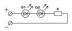 На рисунке Q1 и Q2 - светодиоды, R - резистор. Этот вариант имеет самый высокий КПД. Я предпочитаю такой вид подключения, т.к. при нем достаточно одного резистора на два-три СИД (меньше инсталляционной работы по пайке). Минусы такого варианта: при сгорании какого-либо СИД, сгорают и все остальные.