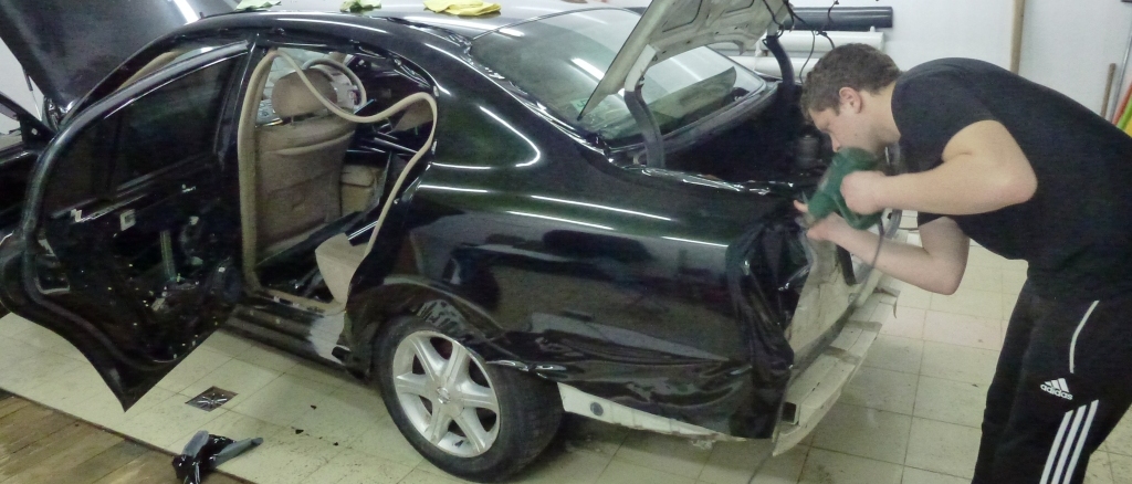 Далее следует этап арматурных работ. С автомобиля необходимо снять все навесные элементы, такие как дверные и оконные молдинги, эмблемы и зачистить их и поверхность под ними от двустороннего скотча не повредив при этом лакокрасочный слой. Обшивку салона, ручки дверей, рейлинги, зеркала, передние крылья, решетку, бампера, пороги, спойлер и оптику автомобиля также требуется аккуратно демонтировать, устроив ревизию крепежным элементам.