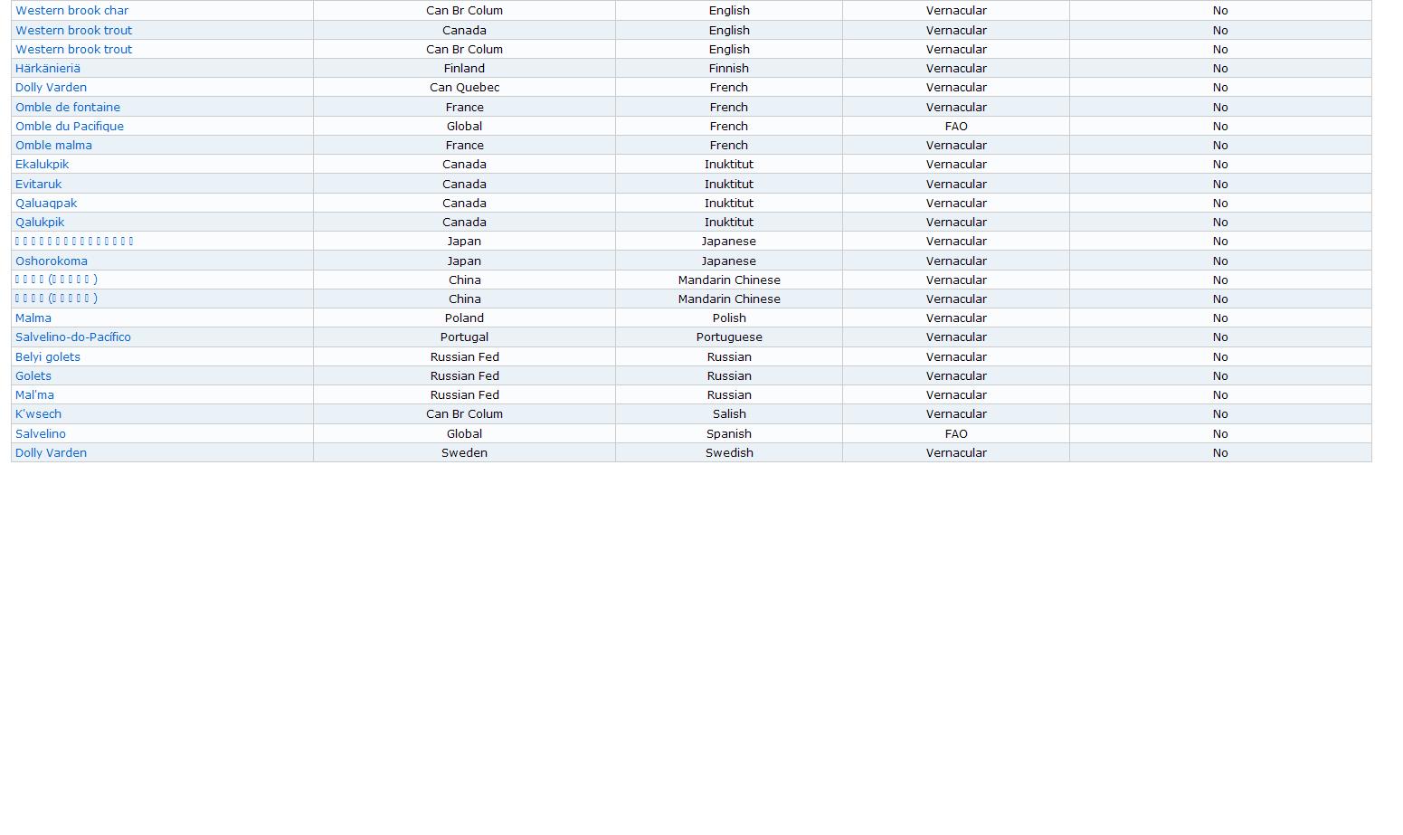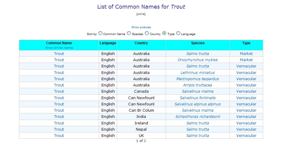 Trout Sort by Common Name Species Country Type Language Common Name