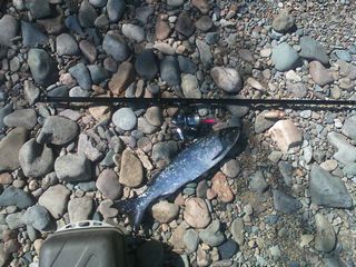 ) тк заметил место приличное. в итоге за пару часов 2 кетинки. после дел к 16-30 заехал к сопке, где ЛЭП, народу нету почти, скучають. воды много, плес широооокий и медленное течение. времени в обрез, к 18-30 надо быть в городе. покидал в проводку, зацепился кижучок. понравился как он бодался, хоть и невелик (2,6 кг), раз 6 отматывал лесочку - 0,27 мм, я её на мальминые блесны готовил изначально. кстати вышеприведенная кета сдавалсаь горазда легче - но у неё есть смягчающие обстоятельства - у одной бок еще не зажил, вторая (самая крупная) - с дырками в боках от каких-то пиявок.
