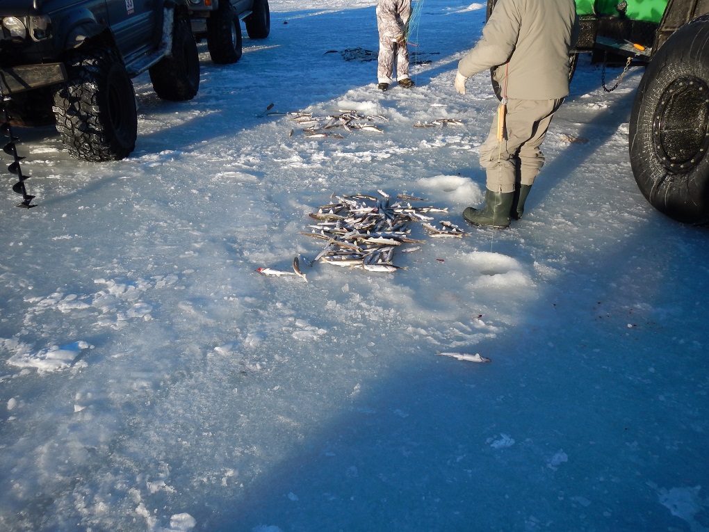 Только приехал с Балаганного.Ночь с 7го на 8е простоял на Уссуле, одна хорошая корюшка и усё. 8го с пол отлива начала брать хорошая навага до 17 часов 60 штук.(почти 2 пакета). Ночевать остался на Нахтаче, не знаю видимо бог есть, в 10 позвонил знакомый и сказал , что на помойке неплохо полавливают.Мы с напарником собрали палатку, бутор и тут началось! Чудом выскочили! На помойке сегодня 5 хорошей корюшки и 1 наважка. Народ вокруг ловил по тихой! Видимо не было у меня сегодня настроя, после переживаний!Лёд вырвало почти по Красочкина.Утонуло 3 машины Газ-66, караван и ещё какая то точно не знаю. Для оставшихся машин, на старом люду ,Балаганцы бьют по берегу дорогу, буранами.
