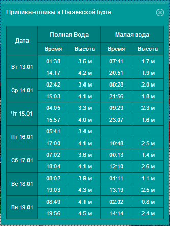 +11, соответственно надо отнимать час. Эти таблицы указывают время приливов/отливов в бухте Нагаева, кстати также как и таблица на сайте приливы.соm , в которой нужно отнимать два часа. В местных таблицах, обычно указывают данные по бухте Гертнера. Всем известно, что время прилива в Нагаево отличается от времени прилива в Гертнера. Для Балаганного вообще другая временная поправка. Вообще, считаю, что эти таблицы больше подходят для примерного ориентирования.