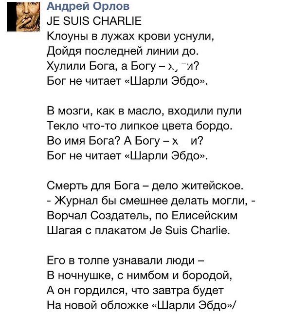 Невзирая на страх, мы не откажемся от истинной Франции с ее свободой, равенством и братством. И пусть миллиарды людей против нас, но миллиарды и с нами. И наши миллиарды – честнее, смелее, чище, добрее и сильней. Ведь даже этот гранатомет, с которым убийцы заявились в редакцию Шарли Эбдо, придуман в Европе.