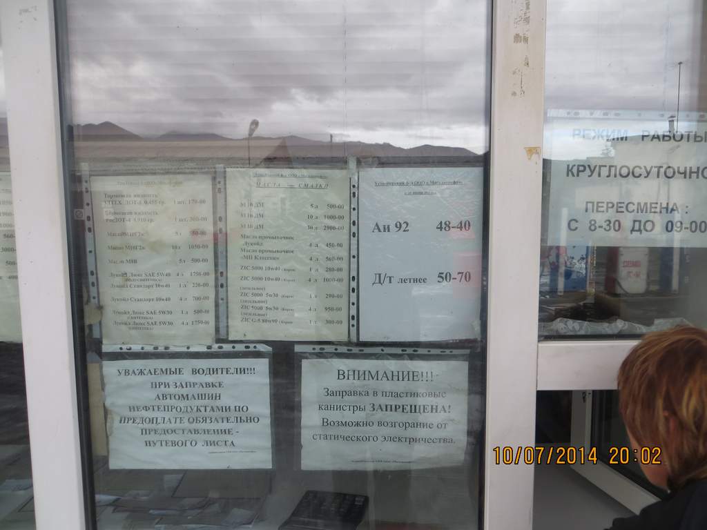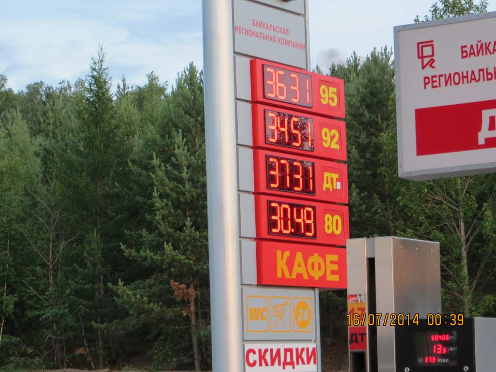 Нажмите для просмотра прикрепленного файлаПо данным вывесок часто встречающихся заправок, после Иркутска, оставшегося в стороне, 95-й стоит в среднем 34-35р., ДТ становится дешевле бензина и стоит около 32,50. Сами заправились на 1724км от Новосиба (за Залари, если от Магадана), плюхнули 95-го по 35р. на 1050р. Обедали в тут же расположенном кафе "Байкал". По интерьеру, оформлению меню и ценам - с претензией на ресторан. Соотношение -"цена - качество" не соответствует. Отвалили на покушать почти 1000р., мясо не разгрызешь. Занесли этот пункт общепита в «черный список».