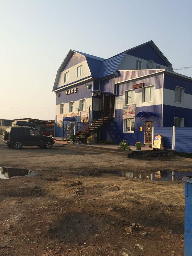 Начало вечереть, пошла глухая тайга. Уже пора бы и поужинать и остановиться на ночевку, но пошла глухомань, все селения были в стороне. Решили ехать до кафешки, ведь должны же быть по пути! Так мы тянули по мелким взгоркам, пристроившись за очередным автопоездом. Лена уже начала роптать, я настаивал на дальнейшем движении – ну не будут дальнобои ехать всю ночь, наверняка тянут до хорошего места! За очередной вершине холма вдруг мы увидели Лас-Вегас!!! Среди пустынной тайги, это так и было. Всё в иллюминациях, светятся неоном магазинчики, заправка, гостиницы и кафешки. Просто какой-то городок для путешествующих и дальнобойщиков! Подъехав ближе, мы увидели вывеску «У Петра», читали на форуме про это культовое место. Свернули направо, замечательно поужинали в кафе «Паллада». Кухня обалденная, причем не дорого – за шикарный ужин на двоих отдали всего 391р. К сожалению, мест в гостинице не оказалось ни на правой стороне от дороги, ни левой. Кое-как найдя место на пятаке, улеглись на ночь в машине прямо перед кафе «У Петра».