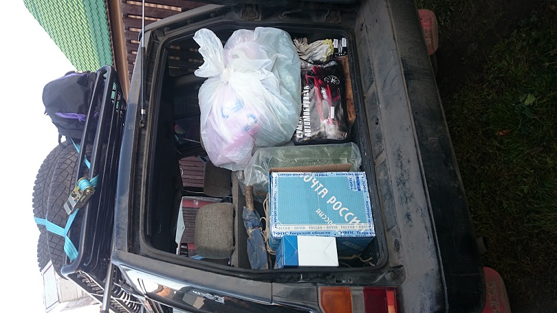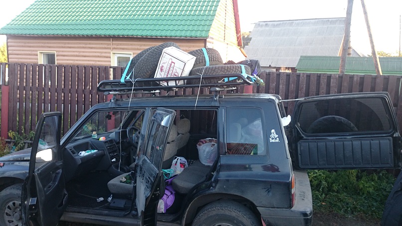 К 10 утра выехали из деревни. Все по плану (фото 1, 2). По трассе сильный ветер, примерно через час езды сдвинулись крепежи багажника (фото 3). Пришлось перекладывать весь бутор в салон машины. Больше ничего и особого не произошло. К 20:00 были в Красноярске, нашли гостиницу “Транзит”, остались там.
