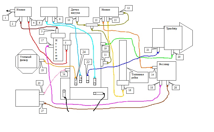 остался вопрос в схеме вакуумных трубок, т.к. выложенная выше схема не имеет одного из клапанов, который присутствует в реале, схемы из мануала и каталогов общие, в них еще дополнительные компоненты, вроде клапана егр, встречаются, схема, срисованная с Вольдемара оценивается авторитетами, как неправильная....