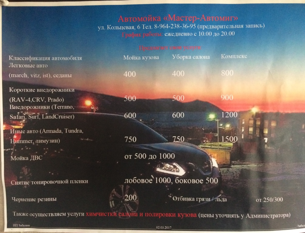 Мойка находится рядом с Идеей, в одном здании с магазином "миршин". Пока шла до кассы дозвонилась и спросила сколько будет стоить помыть кузов и коврики джипу. На что мужчина на том конце ответил "600 р легковая, 700 р. джип". Прошу записать на субботу 12.30, а этот тип уточняет, снисходительно так: "джипы бывают разные, трёхдверные - маленькие или крузак 200". Ответила, что джип большой, после уточнения марки и модели на том конце провода возникла заминка..., может даже кто-то поперхнулся. Всё, говорит, записал, ждём завтра в 12.30.