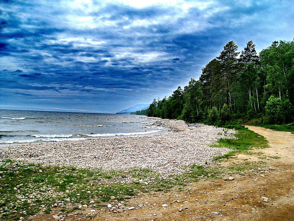 Баргузинский залив – пасмурно –и было не очень красиво..Кстати, ощутили, что возле воды довольно прохладно.