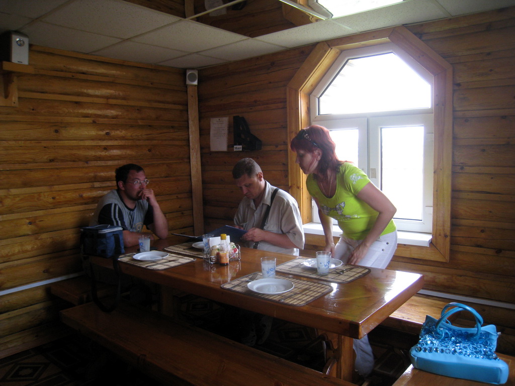 А перед самым въездом в город – я увидел оленя. Но как он прыгал в лес – это надо было видеть. Въехали в город (или поселок – честно говоря – деревня деревней).. Заблудились в поисках переправы – потом пораспрошали – нашли переправу.. Подъехали – и решили пообедать сначала – а потом уже переправляться. Возле переправы – находиться позная. Зашли – накушались поз. Поставили машину в очередь на переправу и начали ждать.
