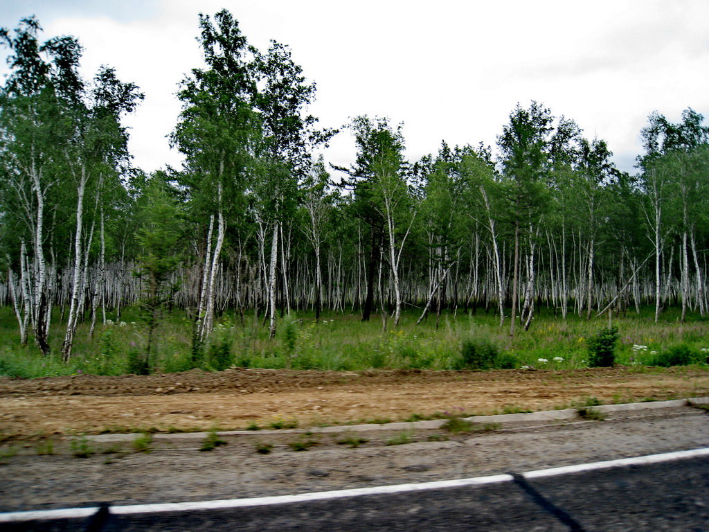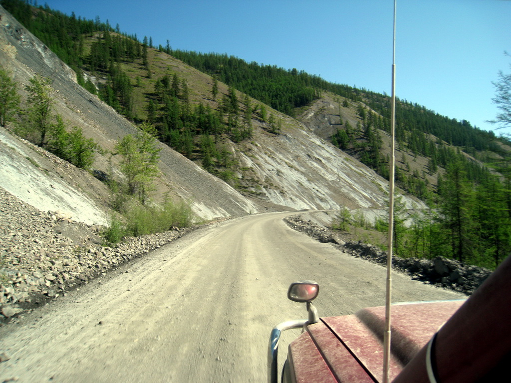 Фото дороги практически нет, потому как штурман опять нагло начал дрыхнуть. Сама трасса начала поднимтаься в горы, вокруг кедровый лес, по обочиная таблички – «Осторожно! В лесу – клещ! Убьет». Решили, что имеет смысл – не останавливаться, и тем более в лес не ходить.