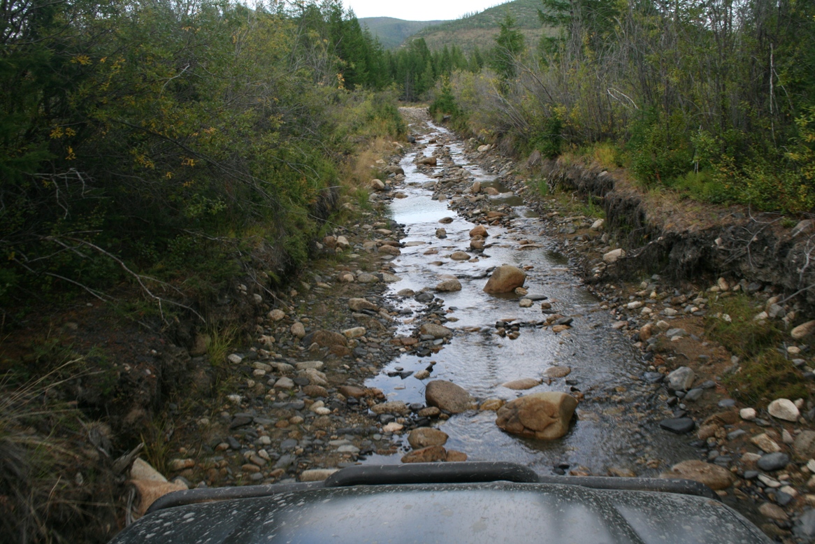 Утром, 15 августа 2009 г. около 10-30, заправив машину под самое горло выехали в направлении пос.Усть-Омчуга, это в районе 250 км. Тенькинской трассы. Ехали не особо быстро 70-90 км\ч, добрались до поселка за три с половиной часа. Сам лагерь находится дальше по трассе, от Усть-Омчуга еще 30 километров до моста через р. Левый Омчуг. Перед мостом сворачиваем направо и….. тут дорога заканчивается и начинается 15-ти километровое бездорожье, местами просматривается построенная во времена ЗК дорога из лиственницы. Кстати никакой охраны подстанции там не было и походу уже давно, и местных жителей тоже нет да и кто там может жить….. посмотрите.
