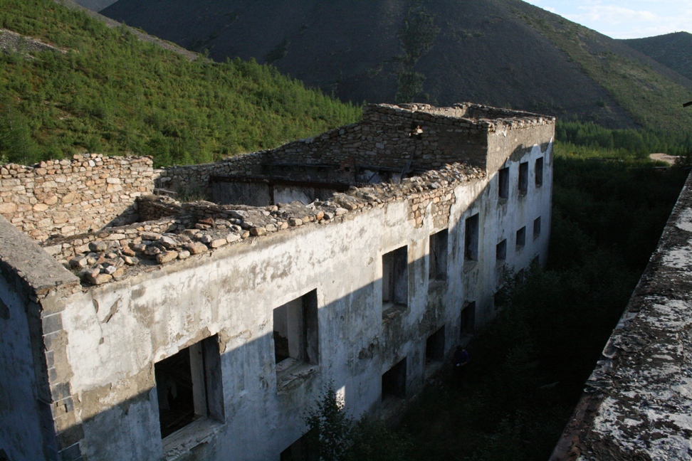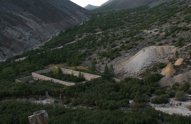 Дорога приводит к основному строению лагеря – фабрике. Вообще дорога должна была идти дальше, но ее убило время и река. Сами сооружения разбросаны на достаточно большой площади. Расстояние между отдельными 2-2,5 км. Сразу скажу что до многих мы не добрались, по причине нехватки времени (что б все исходить пешком нужно было бы потратить не один десяток часов). Расстояние между штольнями и того больше, мы побывали только в пяти которые находились в окрестностях фабрики. Рассуждать по поводу происхождения строений их назначения, численности рабочих и их судьбах в статье не хочу, так как цель ее ознакомить вас с тем что видел сам. Только факты: