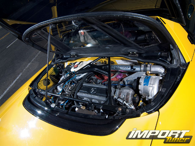 Внешность суперкара должна поддерживаться соответствующей мощностью. Попытаться снять дополнительные 50 л.с. с изначально неплохого мотора С32В — задача не из легких. А получить вожделенные 400 «лошадей» на колесах — практически невозможно. Единственным решением, на взгляд Уилла, было форсирование мотора. Суперчарджер-кит от Boostzilla, первый в своем роде, был куплен у Dali Racing и установлен при содействии Джона Дэвида Метца, для друзей просто JDM, из Revenge Motorsports. Нагнетатель, вкупе с впуском Boostzilla, титановым выпуском GT-One, коллекторами Comptech, иридиевыми свечами Denso, топливным насосом от Supra, и кое-какими добряками от HKS (система двойного зажигания, перепускной клапан Super Sequential, форсунки на 680 куб. см, топливный регулятор, крышечки на маслозаливную горловину и прочие емкости под капотом), тем не менее, не дали той мощности, на которую рассчитывал Уилл.