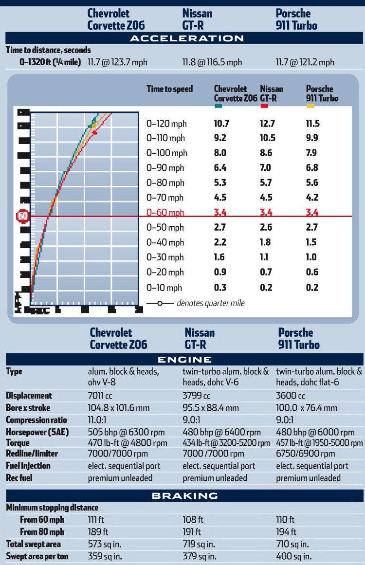 Не секрет, что инженеры Nissan использовали 911 Turbo в качестве сравнения при конструировании GT-R. Каждый раз, посещая событие, так или иначе связанное с GT-R, мы замечали Porsche 911 Turbo, маячивший неподалеку, очевидно используемый инженерами Nissan как эталон. Они равнялись на 480 л.с., выдаваемые 6-цилиндровым «оппозитником» объемом 3,6 литра. Благодаря таким показателям 911 Turbo, весящий 1 682 кг, разгоняется до сотни за 3,4 секунды, вполне достаточно, чтобы посостязаться с Corvette и GT-R, но вот победить GT-R и Corvette вряд ли удастся. Заезд на четверть мили ничего не даст, поскольку и 911 Turbo, и Corvette показывают здесь одинаковый результат — 11,7 с, а GT-R отстает от них буквально на доли секунды.