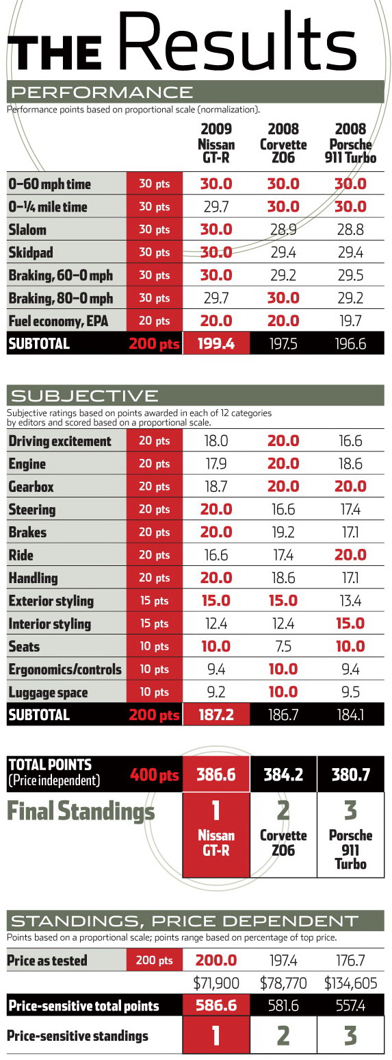 Время от времени на мировом авторынке появляется автомобиль, вокруг которого устраивается такая рекламная шумиха, что не только привлекает к нему внимание профессионалов, но и создает дикий ажиотаж среди представителей специализированной прессы по всему миру: каждое издание стремится первым опробовать новинку, протестировать ее и сравнить в другими автомобилями в своем классе. Nissan GT-R как раз из таких. Как и прежде, наше издание возглавляет очередь на тестирование версии этой необычной машины в комплектации, предназначенной для американского рынка, и ее сравнение с самыми крупными конкурентами: Chevrolet Corvette Z06 и Porsche 911 Turbo.