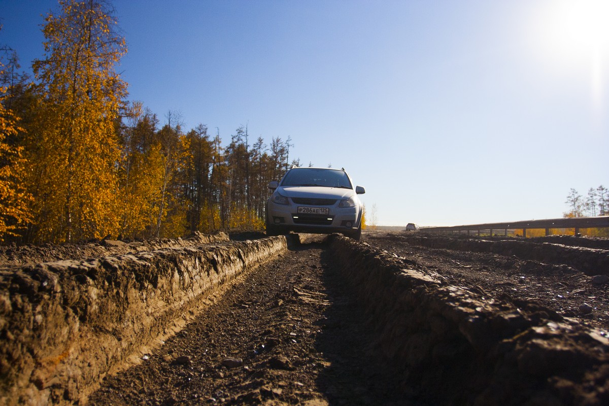От Якутска до Сковородки дорога чередуется: идеальный асфальт и грунтовая гребенка, примерно в равном соотношении.
