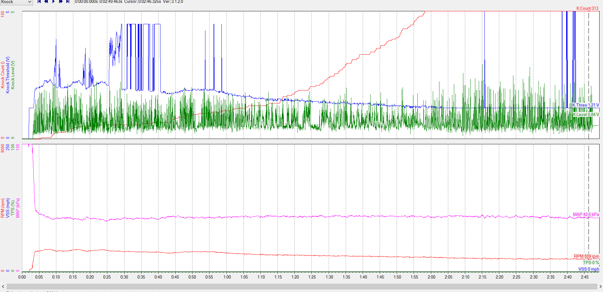 Дело в том, что, мониторинг детонации по вольтажу логера - не очень информативно ( слишком низкая скорость логгирования ), единичные кноки - слишком быстротекущее явление, а отслеживать при настройке нужно именно самое начало детона. Пики детонации по вольтажу превышают на порядок,а то и больше, обычный шум мотора, скажем в моем случае вольтаж пиков доходил до 15-20 в, при общем шуме 1-1.5 в. Перебрав несколько вариантов мониторинга остановился на единственно приавильном ( с моей точки зрения ) - контроль детонации осцилографом. Не получилось найти скрины, возможно удалил, но на рабочем ноуте они есть 100 проц, если интересно, я найду и выложу.