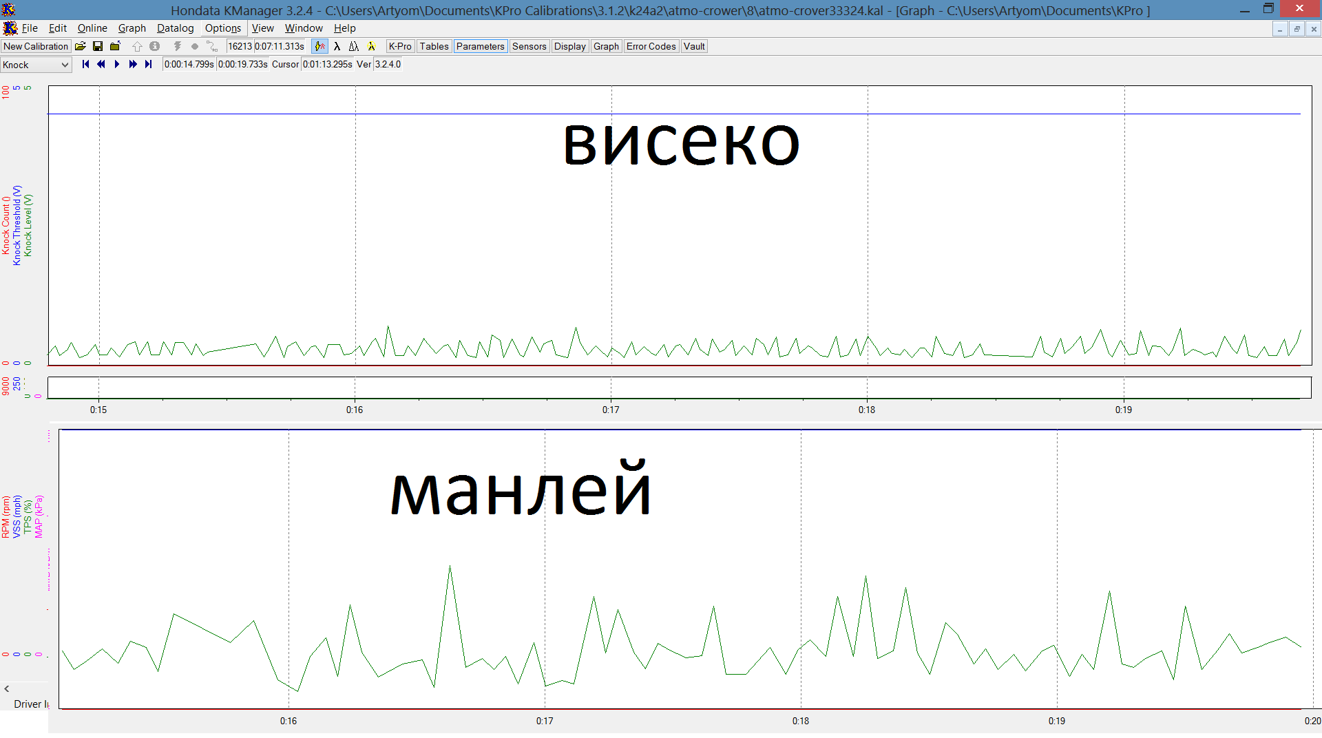 нет не в этом, там гора кноков была т.к. это второй день как я выкатился тогда из гаража и под распредвалы ещё небыла отстроена карта, но даже если брать один из последних логов на манлей (уже после 1000км) и совсем не обкатанный висеко, то даже тут разница видна невооруженным взглядом. висеко явно работает тише....
