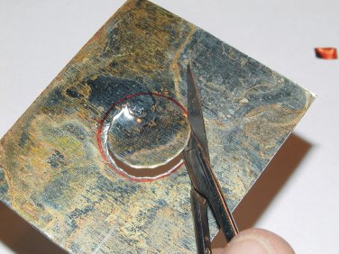Нажмите для просмотра прикрепленного файлаНажмите для просмотра прикрепленного файла Обрезаем жесть по получившемуся контуру. Затем делаем разрез между примыкающими друг к другу усиками. Надеваем накладку на заднюю часть цоколя лампочки и подгоняем внешнюю форму кольца и усиков. Далее, расширяем центральное отверстие в кольце, примерно так, как показано на фото, чтобы фиксирующая пружина проходила в это отверстие и фиксировала лампочку за цоколь, а не за накладку.