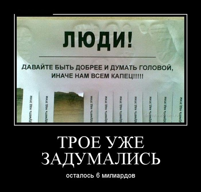 Для тех кто какулями будет бросаться, ни грамма в посте моем нету желчи или злобы на всех персонажей описанных, ухожу я потихоньку в русло спокойствия, одно только почему то грустно от осознания всего этого, но я стараюсь спеть себе песенку кота Леопольда - Неприятность эту мв переживем, и тратить энергию на близких и родных, только кто то во мне все одно иногда выскакивает и пытается сказать - ОДУМАЙТЕСЬ ЛЮДИ!!! Равно как и на дороге иногда, могу позволить себе, прижать мало-мало чудика едущего по середине - потому что тут накатано, или блондинке, говорящей по телефону и едущей на уже давно загоревшийся красный прямо, а я пытаюсь все таки завершить маневр, поворачивая налево на перекрестке, взять и рвануть в лобовую, так что аж на бордюр она прыгает, потому что мне не все равно, раз ей в лоб прилетят, два, а на третий - думать будет, я надеюсь, так же как и эта будет думать где перебегать дорогу.