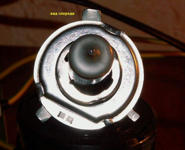 На следующих фотографиях показано, как располагается лампочка в фаре до ее поворота, и после отрезания усиков и установки в новое положение. Для наглядности, усики на цоколе лампочки закрашены красным маркером.