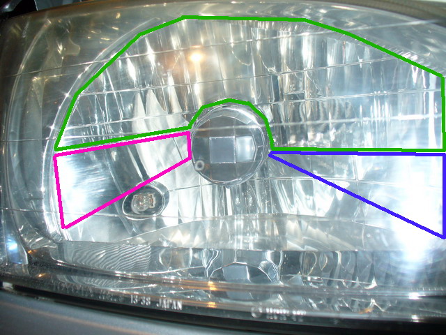 Второй способ, состоит в том, чтобы заклеить непрозрачной пленкой определенную часть стекол фар, закрыв тем самым, ту часть светового пучка, которая светит влево и вверх. На фотографиях показано, как это сделано на автомобиле Тойота-РАВ4.
