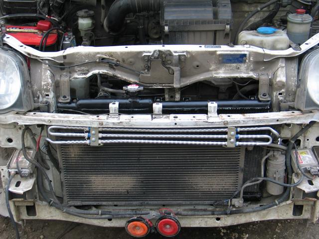 1. радитор охлаждения масла Газелевский (сделан из дюралюминивой трубки свернутой змейкой в три ряда с шагом примерно 3 см, длина радиатора около 80 см, как раз по размеру наших радиаторов ОЖ и кондера). Должен уже идти с креплениями.