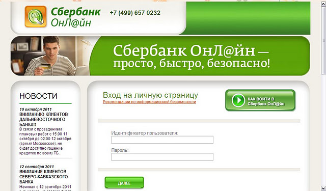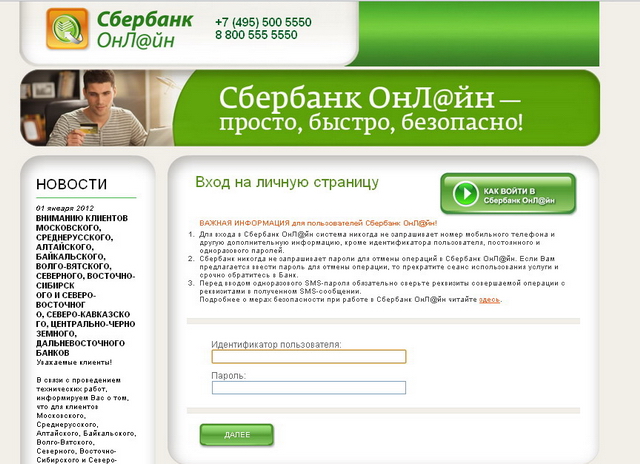 Захожу я утром на сайт www.sbrf.ru чтобы сделать перевод денег одной девушке. Вместо обычной страницы сбербанка у меня сразу по этому адресу грузится сбербанк онлайн. Имея двоих детей, орущих над ухом, мало кто на ЭТОМ этапе уже заподозрил бы неладное. У меня обычно логин сохранен, я по новой всегда ввожу пароль. Тут логин и пароль надо было вводить заново, я ввожу без задней мысли. Потом выдается страница, что для получения разового пароля по смс, введите номер телефона. Напоминаю, все это происходит на странице www.sbrf.ru и интерфейсе сбербанк-онлайна. Я ввожу номер телефона. На него через какое-то время приходит смс о разовом входе в аккаунт, я ввожу этот пароль о разовом входе.