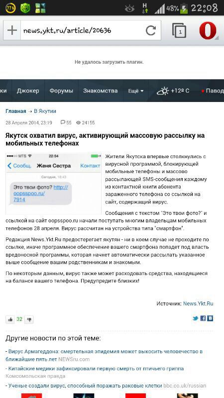 Сейчас по местным новостям передали,что появился новый вид телефонного мошенничества. Его суть: тебе приходит смс от знакомого с прозьбой заценить его новое фото и ссылка на сайт. При переходе по ссылке,на твою трубу автоматически загружается вирус,передающий данные твоих счетов с подключенным мобильным банком на сервер мошеникам и дающий им неограниченный доступ к манипуляциям с этими счетами. Так же при переходе по ссылке данное смс автоматом рассылается на все контакты! Народ,будьте бдительны!!!