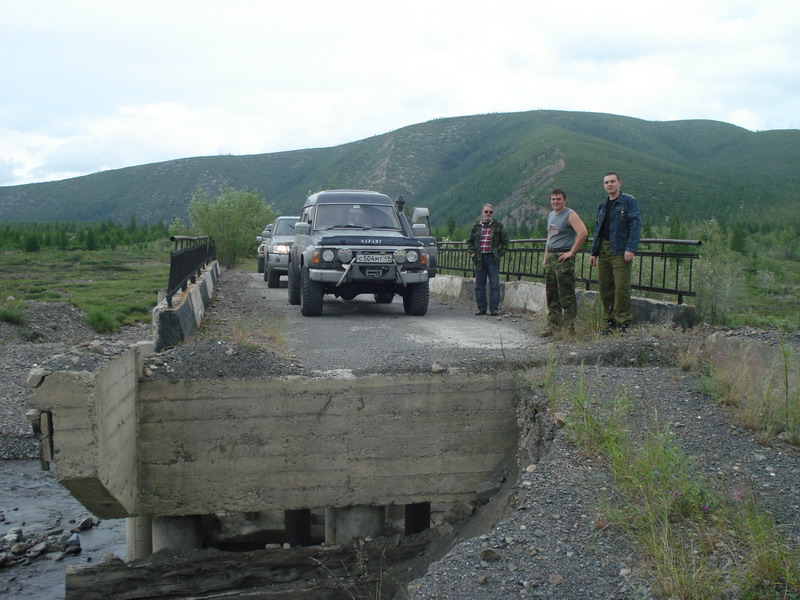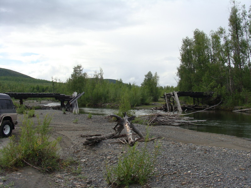 Доходим до очередной развилки, на право Мария Раскова, нам опять налево. Свернули…дальше цивилизация заканчивается, интенсивность движения по этому участку 3-4 машины в год, не больше, хотя дорога хорошая…местами. Иногда получалось разгоняться до 50 км/ч. Бетонные мосты стоят, но с обсыпанными заездами, деревянные разрушенны, так что проходить реки только в брод.