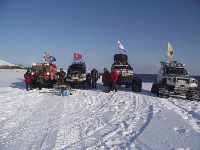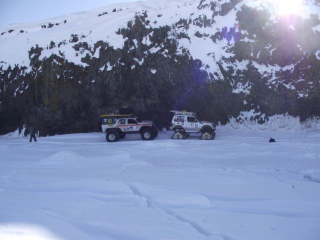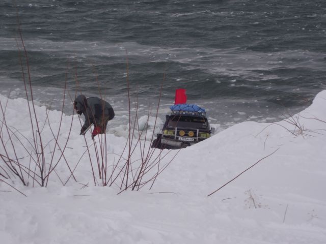 Вместо гусянок назад установили на задний мост Паджеро "масенькие" 35-ые колёсики и полезли в о.!.!.у До подъёма выдохнули. А вот тут-то и потратили пельменные калории на лопаты часика за 3. Однако Сохатый даже без прицепа не взял высотку. Вот он звёздный час АнатлеНиколаемобиля. Они слегка подровняли лопатами тычок слева и поползли вверх. Но и тут без лебёдки не обошлось. Закопали в сугроб "Шнягу" и, заякорившись, вылезли. У Лося уже образовались два якоря. Они нас и извлекли. Затем дВова с Олегом подползли, их расцепили поочереди выволокли. Продос рванул вниз за своим прицепом. Пока поднимали в две лебёдки нашу арбу, Океан пару раз окатил Толемобиль потной смесью шуги, солёнки и близкой пресной ручейковой воды. Тросолебёдные дела отняли ещё тройку часиков. Остаточные запасы пива закончились именно на этой вертикали.