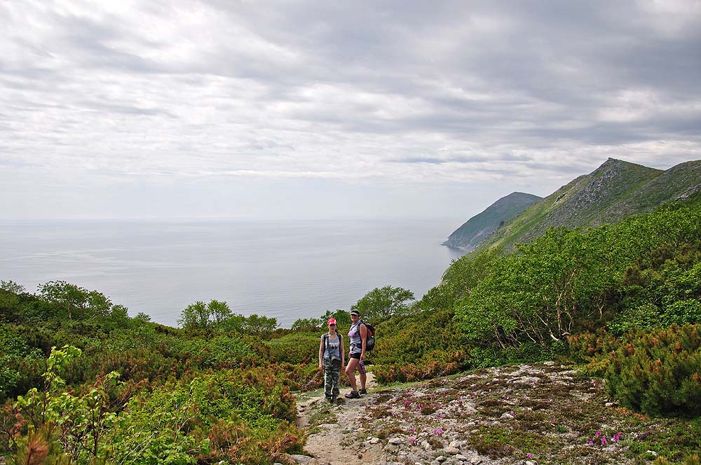 Туда от Холодного ручья шли очень не спеша 3,5 часа, обратно спустились к морю в лисий распадок и по отливу дошли до отсыпки.