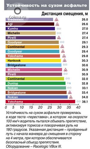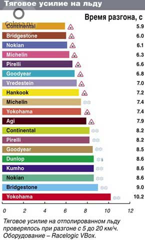 В то же время "шинные" испытания у обоих российских изданий отличаются методикой. Например, у "Авторевю" время разгона измеряется при ускорении с 5 до 35 километров в час, а журналисты "За рулем" - с 0 до 30 километров в час. Вдобавок, отличается и используемое экспертами оборудование.
