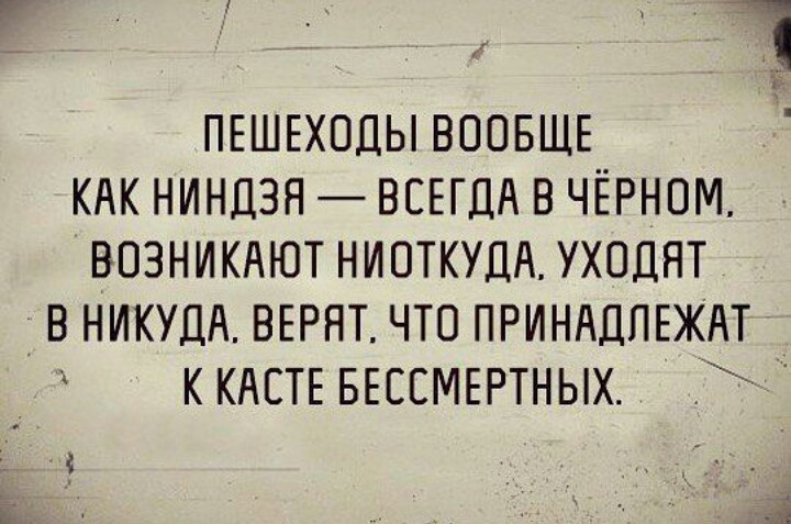 Будьте внимательней на пешеходных переходах! Поверьте, даже самую толстую жопу остановить значительно проще, чем самую лёгкую машину. Секунда тупости – водитель в клетке, вы в ящике, оба на Ютубе. Тонна металла не различает вас по расе, религии, полу, заработку, длине и глубине принадлежностей., все кости хрустят одинаково мелодично. Если водитель зимой сигналит вам на переходе, он не "мудила, кому ты сигналишь?! знак видел?!",[size=