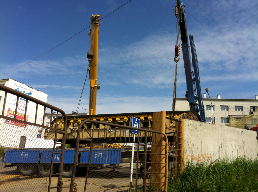 Это транспортёр для подачи руды в мельницу. Ничему народ жизнь не учит, в прошлую пятницу такой же тягач с транспортёром добрался до перекрестка Потапова - Полярная, где транспортёр чуть не свалился. Ставили на место краном. Сегодня, то же самое, но результат печальнее. Крепёж не проверяют, только после падения стали крепить цепями...