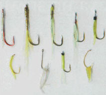 Основная леска - 0,25 мм, окрашенная в черный цвет. Такая леска хорошо заметна на фоне льда, поэтому работать с ней намного легче. На конце лески закреплена небольшая застежка с вертлюжком. Ставка с мушками крепится за завязанную на ее верхнем конце петлю. Основная леска ставки должна быть бесцветной и иметь диаметр 0,20-0,22 мм. Поводки делаются из лески 0,15-0,17 мм или из сложенной вдвойне лески 0,12-0,13 мм. Основные типы приманок для корюшковых «самодуров», на которые ловят в районе Магадана, показаны на фото.