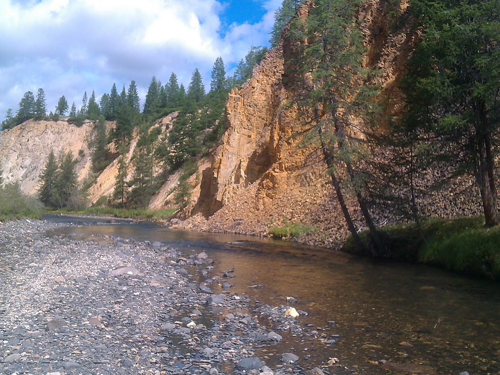 Нажмите для просмотра прикрепленного файла. Вернувшись к машине, сварили ухи, решили ехать на Хету. Заночевали уже на Хете. Утром в воскресенье попили чаю, и пошли ниже по течению. Прошли пару километров и ничего... Решили заехать на руч. Гипотетический, пройтись посмотреть что он из себя представляет. Немного проехали по ручью и пошли пешком вверх по течению...