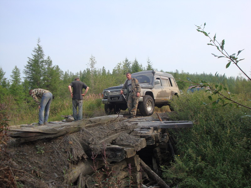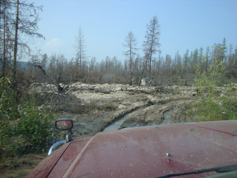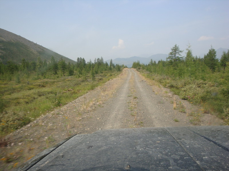 жара и пыль становились только хуже. На Бурхалинскомперевале Турбосафарь закипел, жара стояла за 30. Остановились около сворота на Мяунджу, от Магадана отошлина 700 км, федералка уходит прямо, а намсворачивать налево от цивилизации на Старую дорогу, вдали белел многоэтажкамиброшенный Кадыкчан. Перекусили тушенкой и двинули дальше, было уже около 9часов, а ночевать по плану должны встать у метеостанции Эмтегей, до которойбыло еще больше 30 км по Старой трассе.