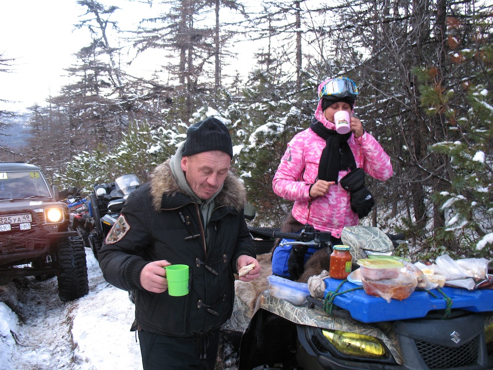 Как оказалось, устроил вселенский затор, опытный образец Краснознаменного, ордена Ленина Ольского автозавода. Героическими усилиями (можно сказать в полевых, а точнее в горных, условиях) команды суровых механиков удалось (необходимо отметить что не без крупной дозы пива) поставить в строй легендарную автотехнику. При этом, техника от внимания кривовато улыбалась во всю морду (эмоция была непонятна: то ли была довольна, или, что хуже - злорадствовала).