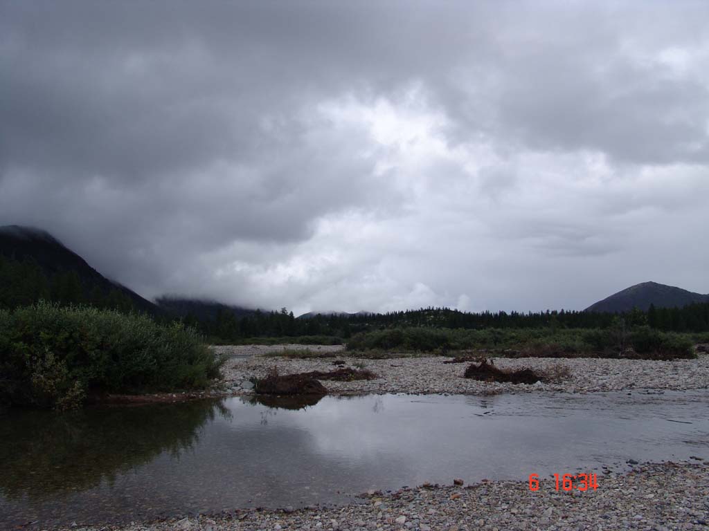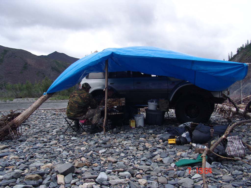 299:ледник.jpg]Часть 2(продолжение).Приехав на озеро увидели возле домиков шишигу.Ну думаем облом с ночёвкой.В итоге после знакомства со всеми, были определены на ночёвку.Дождь шёл не переставая,и ставить в лесу палатку ,а потом и спать в ней, было чем то нереальным.После пробуждения утром нас обрадывали,проливной дождик поднял уровень воды в ручье.Это означало, что вода уже поднялась во всех окрестных ручейках и речьках.Решили не ждать, а выдвигаться в путь.Хотелось очень сгонять на Бохапчу порыбачить,но незная толком дорог, ехать в такой дождь на одной машине было страшновато.На общем сборе решили ехать в паре с газ 66 по Армани.Приводились аргументы в пользу этого пути."Дорога" короче на 30-40км,двумя машинами попроще и плюс мы там не разу не были,глянуть дорогу.На вопрос сколько бродов серьёзных,сказали 5 не больше.Если бы я представлял эту дорогу,никогда не подписался ехать по Армани.В итоге бродов оказались штук 30.В некоторых плыл и 66 по борта.Но самое первое испытание поубавившее пыл оказалось болото ,находяшееся недалеко от озера.Это то место, которое сфотано в этой теме раньше, где 66-ой с кунгом лежит в луже, или жиже.Говорят туда весыпали 5 камазов камней.Нам была предложена дорога в обьезд по кочьке.Прошли мы, глянули,тоже не подарок,вокруг всё мягко,деревьев нет(лебёдку зацепить не за что)а самое главное спасители на шишиге не подьедут и близко.Посадили в итоге меня за руль(типа если засадит будет поорать на кого).Я решил ехать по пути Газона,если застряну хоть дёрнуть можно будет.Все блокировки активизированы,газ в пол (вывози родная).И выскочил как пуля,правда в одном месте всплывать начал(аж жижа в салон затекла).Дальше дорога пошла по долине, мимо огромного ледника.Этот участок показался асфальтом,по сравнению с другими.Подьехав к верховьям реки Армань, мы были немного шокированы количеством воды.На вопрос где тут дорога,было указано на речьку.Перед плаваньем поставили столик,достали еду ,чай в термосе и не только чай.После небольшого перекуса,сказав с Богом,двинулись бороздить просторы Армани.Где ехать, я даже представить себе не мог,хорошо впереди шёл наш целеуказатель.В некоторых местах шишига ныряла в лес.Причём с реки заезда видно не было.Пацаны молодцы,если мы теряли их из виду ,останавливались,и даже возвращались за нами, недождавшись.По лесу есть куски старой дороги ,вполне пригодные к проезду,они, т.к. местные, их хорошо знают.По выезду с озера нам было сказано, что ехать будем потихоньку, на 2 скорости.Ехали они на 2ой космической наверное,догнать их было местами очень сложно.Пару раз дорога выходила на осыпь(крутая сопка,дорога посередине и обрыв внизу метров 100).В одном месте пришлось становиться на подножку, из-за опасности перевернуться. В одном месте остановились прям на осыпи и нам показали на вход в шахту на другой стороне реки,в сопке.Там добывали касетерит, из которого в итоге выплавляли олово.Один из местных поднимался на сопку ,заглядывал в шахту.Метров 7 прошёл,на полу лёд,а дальше не рискнул,своды шахты сгнили и в любой момент могут рухнуть.Рядом через речку стояла фабрика,от неё уже остались только куски бетона.От этого места если пройти 7км в сопку,есть озеро Голубое находящееся на вершине сопки,в кратере.Дорога правда заросла и местами обрушилась,поэтому только пешком.А если пройти 25 км будет заброшеный п